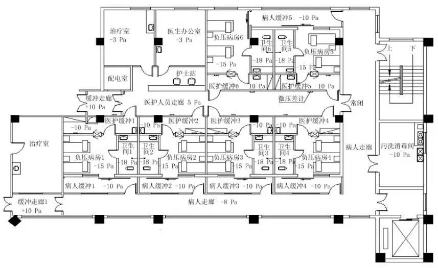 負(fù)壓程度由高到低依次為衛(wèi)生間、負(fù)壓隔離病房、病人走廊、緩沖間、醫(yī)護(hù)走廊、醫(yī)生辦公室。這也有別于以往負(fù)壓病房的設(shè)計(jì),應(yīng)該以整個(gè)負(fù)壓隔離病房區(qū)作為污染受控隔離對(duì)象,在此基礎(chǔ)上進(jìn)行壓差控制,更有利于防止污染物的擴(kuò)散。有壓差要求的相鄰場(chǎng)所,在相通的門(mén)口目測(cè)高度安裝微壓差計(jì)。