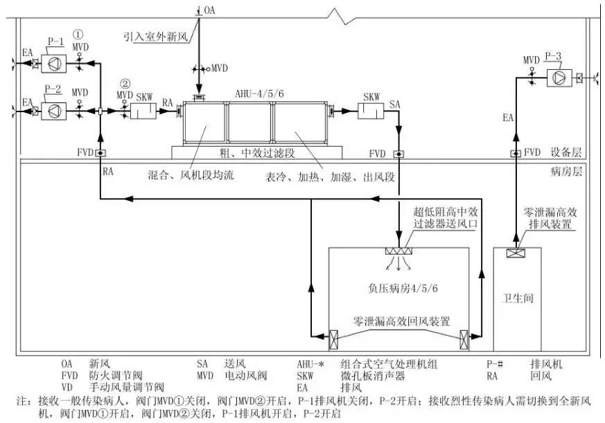 4)1,2,3號(hào)負(fù)壓病房采用自取新風(fēng)形式,且可切換為全新風(fēng)供給,以滿足烈性傳染病人治療與隔離需要。