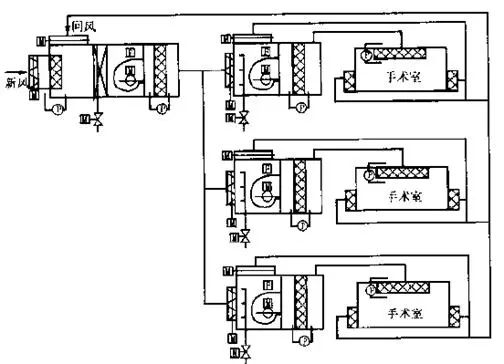 采用這種方法會(huì)造成冷熱抵消的現(xiàn)象,系統(tǒng)的能耗增加。此外,風(fēng)管式再熱電加熱器的容量有限,限制了送風(fēng)參數(shù)的調(diào)整幅度,而且這種方法只能單向調(diào)節(jié)。因此,不同凈化要求的手術(shù)室合用系統(tǒng)時(shí)其凈化等級(jí)不宜相差過(guò)大,以一級(jí)為好。